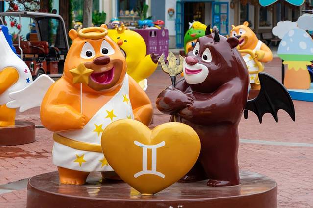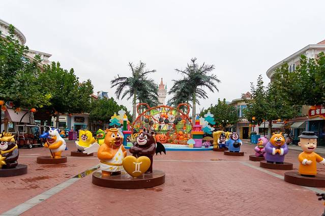 在进入景区前需要进行扫码测温验票方可进园,进入大门首先映入眼帘各种造型的熊大熊二,让人立马带入熊出没的欢乐世界之中,再加上惊叫狂欢主题的氛围布置更是美哉。