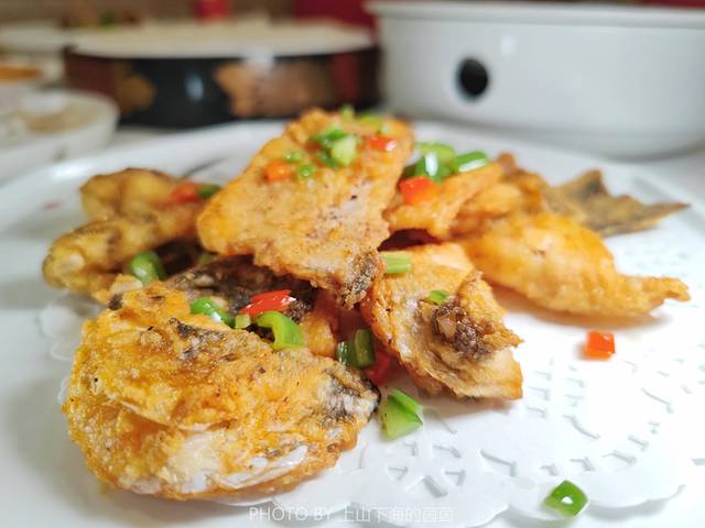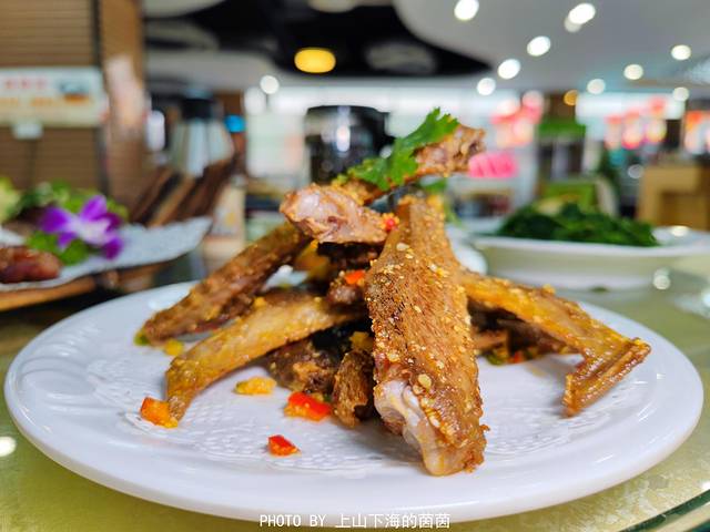椒盐金雕鱼骨:完美演绎什么叫做“一鱼两吃”之“连骨头也不放过”!香酥可口的鱼骨源于入味时口感热烈椒盐和盐的咸香,鱼骨的脆爽感让人爱不释口!这里的鱼骨是比较多肉的,色泽金黄,脆而不煳,一口咬下去口感很实在。外脆内嫩,椒香惹味,下酒非常一流!