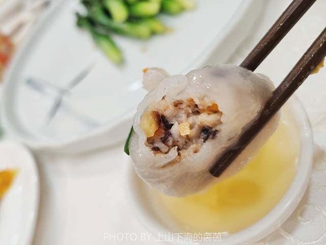 花旗参汤海参饺:泡在花旗参汤的饺子光是外观就很讨喜!透过QQ的水晶饺子皮,可以隐约看到里面被塞得鼓鼓囊囊的海参粒,咬开一个口子可以看到饺子馅诚意满满!
