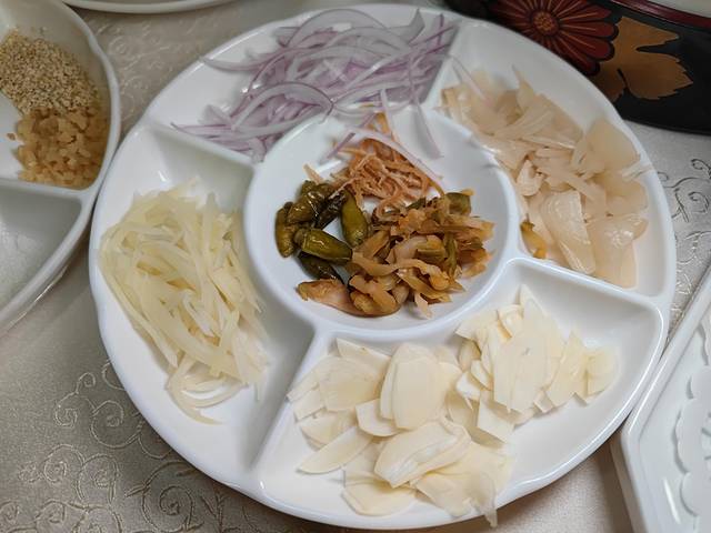 和其他地方的吃法略有不同,南记的配料是两大盆!店员会很热情地先演示一遍捞起的方法,这种仪式感满满的吃法直接将小姐妹给“震住了”!各式香、辛、酸、甜的佐料把鱼生的鲜甜尽情地带出;相对起普通的鲩鱼,金雕鱼生口感更加感脆爽、清甜、滑嫩,满口溢香!