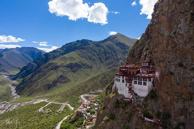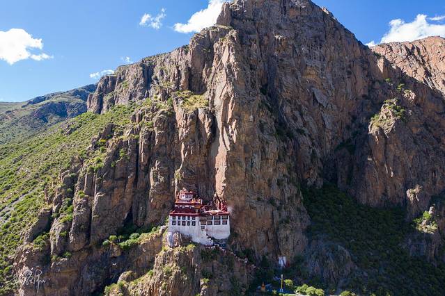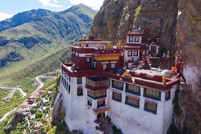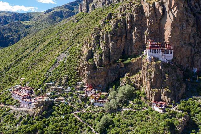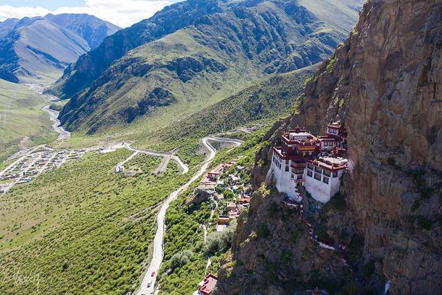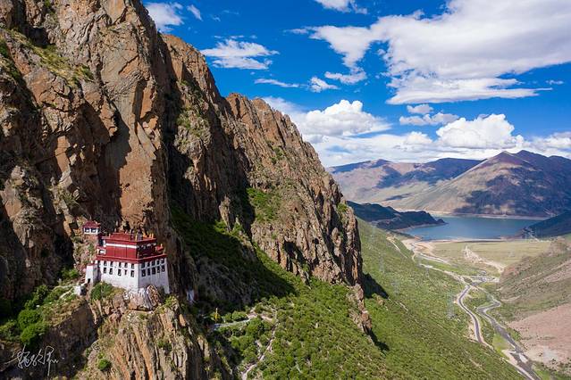 相信到过拉萨的人多多少少都去过扎耶巴寺,在拉萨,建在悬崖峭壁上的寺庙可不止这一座,经过蜿蜒的公路,眼前的山腰的悬崖峭壁上出现了一座寺庙。