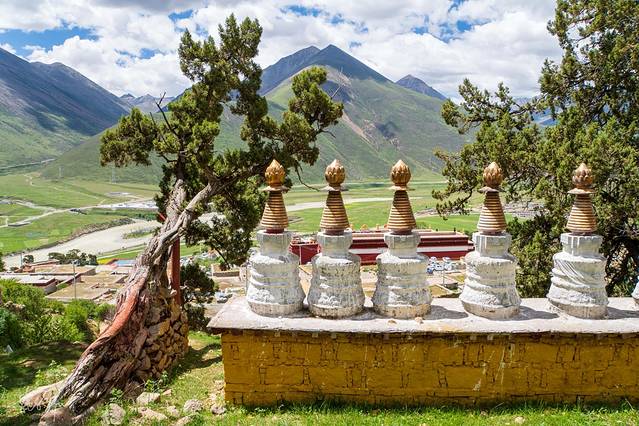 热振在藏语里是“根除一切烦恼,持续到超脱三界轮回”的意思,热振寺是典型的藏传佛教寺院,以红色为主的佛殿,金光闪闪的塔尖儿,散落在山坡上的僧舍,满坡的翠柏,景色迷人,让人只想多待一会儿,舍不得离开。