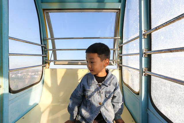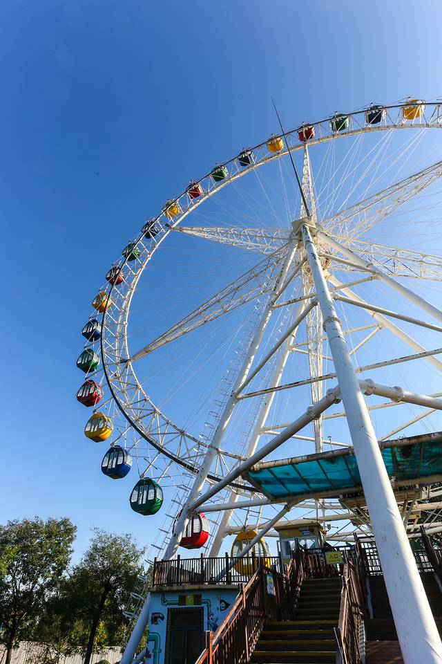 摩天轮更是小孩子们的最爱,似乎承载了每个孩子心中的蓝天梦。游乐园的摩天轮一圈大约10分钟,当摩天轮带着我们缓缓地上升到最顶端的时候,整个园区都能看的非常清晰,远处的水库也超级漂亮。