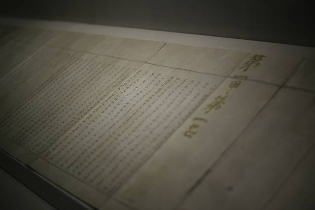 镇馆之宝——赵秉忠状元卷为明万历二十六年(公元1598年)状元 赵秉忠的殿试卷,是目前大陆唯一的殿试状元卷真迹。这件保 存良好的珍品为19折册页,横长共268厘米,每折通高 47.6厘米,宽14.1厘米。封面、封底均为全绫装裱。卷首顶天朱书”第一甲第一名"六字,为当时的皇帝朱翊 钧御书下铃、,弥封关防”长印,占一折。