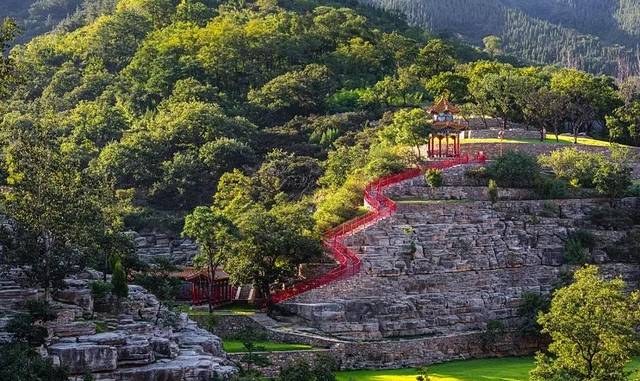 边山坡上,筑有一道道错落有致的石堰。这些石堰层层叠叠,大部分是天然石块形成,在其上又被人工堆砌而成许多半圆形石堰墙,上面有的栽种了林果和草坪,形形色色,风景独特。山间的层层石堰都有青石小道蜿蜒相连,谷间修建了连廊、栈道。走在这山石画廊间,犹如世外桃源,又如童话世界。