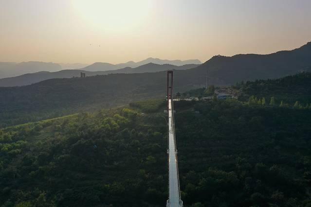 来到九龙峪景区,云天飞峪是不能错过的。这个项目是一架巨大的跨山谷玻璃桥。桥体悬于两峰之间,两峰地势险峻,悬壁陡直。桥面全长588米,宽2.5米,桥面距谷底最深高度约128米。风和日丽之时,踏在玻璃桥上,景区美景尽收眼底,行走其上彷如御风而行,惊险无比;云深雾重之际,桥上悬空赏景漫步云端,如若“云中跳桥”。