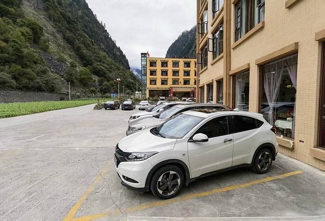 九寨沟沟口的道路很窄 但酒店还是能挤出地方供客人停车