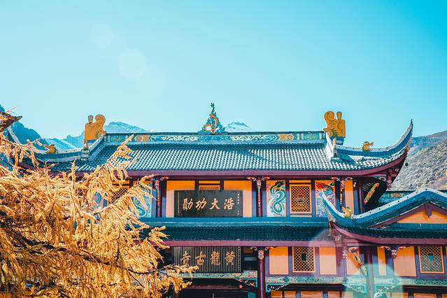步行大约40分钟后,抵达黄龙古寺,可以在此稍作休整,距离五彩池还要爬200m的栈道。