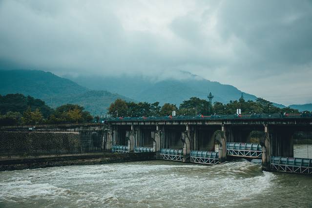 都江堰由鱼嘴分水堤、飞沙堰溢洪道、宝瓶口引水口三大主体工程和百丈堤、人字堤等附属工程构成,把汹涌的岷江分隔成外江和內江,外江排洪,內江引水灌溉,造就了成都这一天府之国。