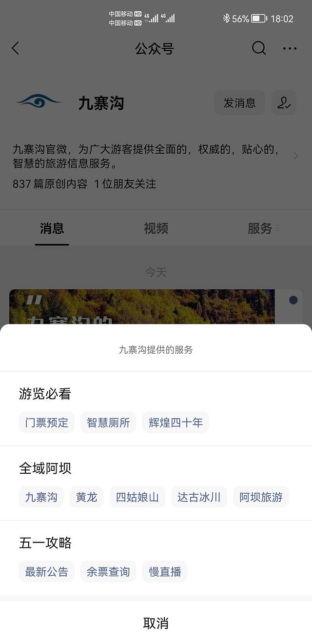 关注九寨沟微信公众号,点击门票预定即可,同时还可以预定达古冰川等景区门票