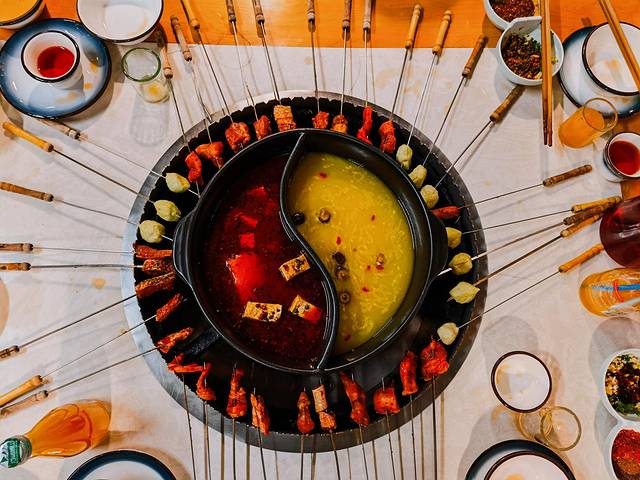 附近有很多吃的,步行就可到,饭后沿着河边散散步,可巴适得板。