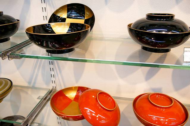 漆器指的是用从漆树采集的树汁(生漆)精制而成的涂料反复涂刷制作而成的餐具。主要展示销售的漆器是用树脂制成并涂有树脂涂料的商用漆器。因为这些漆器常被日式餐厅和旅馆采用,所以应该不少人都有见过吧。