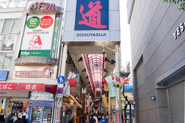 如今商店街修了拱顶,变成了长约150m的商店街,在这里,从餐具、菜刀、锅、平底锅等常见厨房用品到章鱼小丸子锅及食品样品都能找到。
