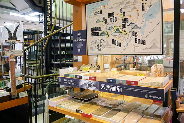 其他还有用来磨菜刀的磨刀石。不仅有不同硬度的人造磨刀石,还有一个区域卖的是只能在特定地方采集到的珍贵天然磨刀石。工作人员会传授合适磨刀石的选择方法和磨刀方法,可以跟菜刀一起购买。