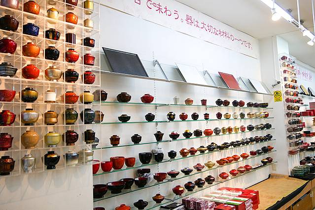 接着我去了经销漆器和筷子等的“大阪漆器”。店内空间很是开阔,完全没有拘束的感觉,整齐陈列着各式各样的碗筷以及餐盒等。
