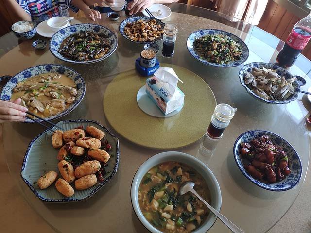 午饭~从网上查到这家店点评不错,就开车40分钟到了那儿,是一家规模很大的农家乐~点了平时吃不到的跳跳鱼和望潮,海鲜还有蛏子,炖杂鱼……另外老板推荐了炸豆腐和炒糯米丸子,七八个菜吧~上菜的时候有点傻眼,量太大了,不是南方菜的风格啊😂个人感觉海鲜味道一般,望潮老贵了,但还不如乌贼好吃,倒是老板推荐的素菜,挺符合我们的口味~