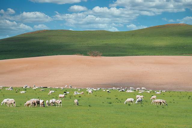 呼伦贝尔草原 秋天的呼伦贝尔大草原天气不再炽热,草原的颜色从一浓郁的碧绿过渡到温暖的黄绿色,牛羊在悠闲地漫步,"牧草王国"最美的时刻宛若天堂。