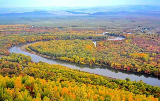 一望无际的平坦草原被秋色浸染,镶嵌其中的河流湖泊和兴安林海让草原五彩缤纷。