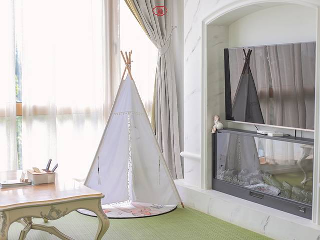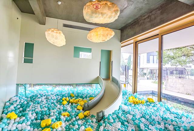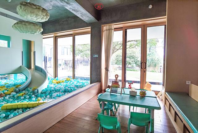 除了房间里的玩乐设施,公区也有室内童玩区,超大蓝色海洋球池、大型乐高积木,趣味滑滑梯,娃娃们在这里可以玩上一整天不烦闷,大人更是可以放心的乐得清闲。