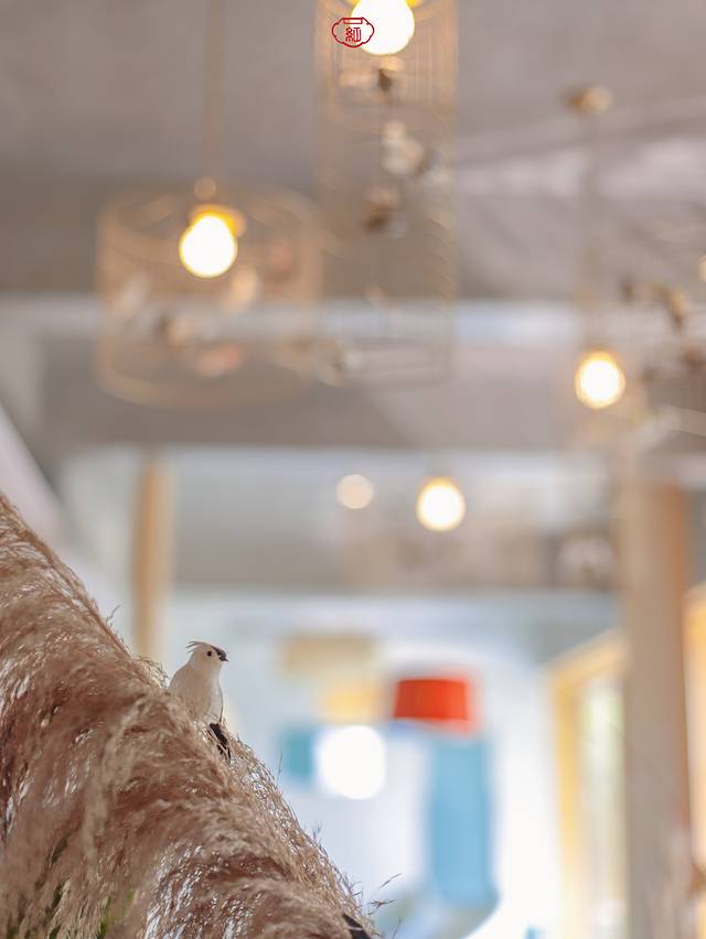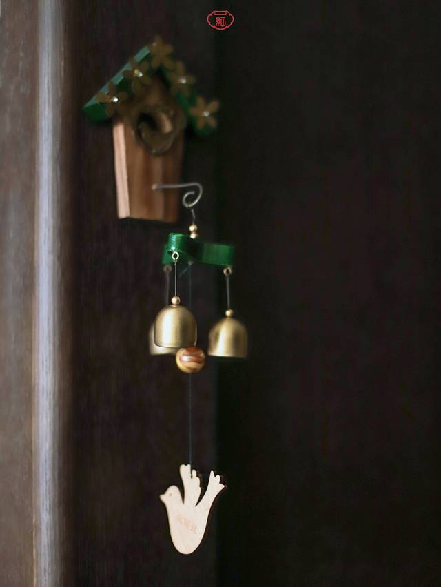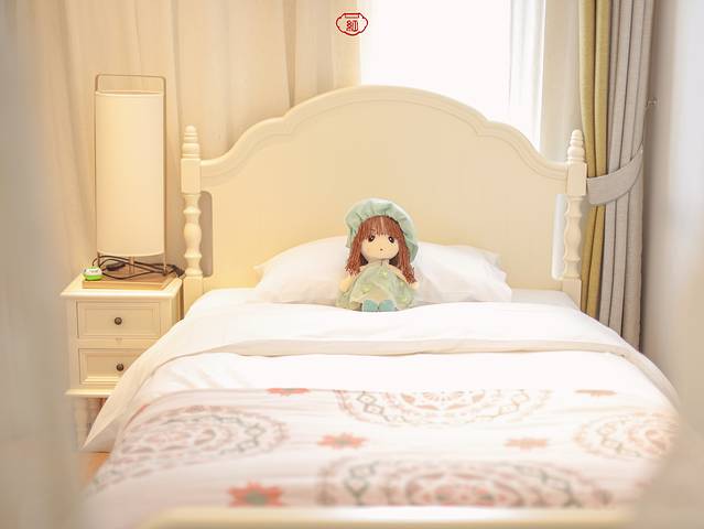 最让我意外的,还是房型,我住的是一期的爱丽丝房间,位于一栋黄色建筑的三楼,在走廊里就已经感受到了与众不同,因为每个房间的门都很大,而且门上挂着小铃铛,铃铛下的小鸽子上,写着“爱丽丝”三个大字,我的房间到了。