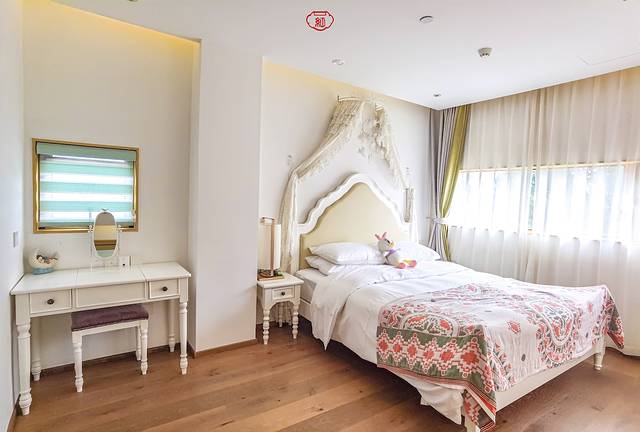 细细参观下来,爱丽丝有两间住房,一间房是娃住的,一间是家长住的,这两个卧房都设计成少女心爆棚的公主风,一个卫生间联通主卧,也是欧式风格装修,还有浴缸哦。