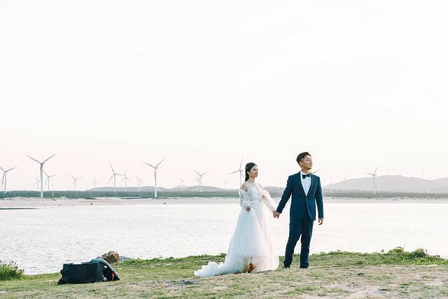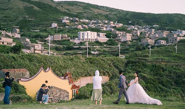 在路边的小草地上,偶遇了一对拍婚纱的新人,给这里的景色带来了别样的色彩