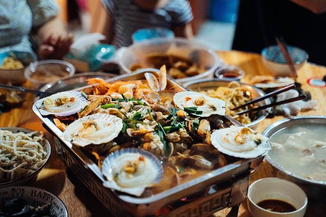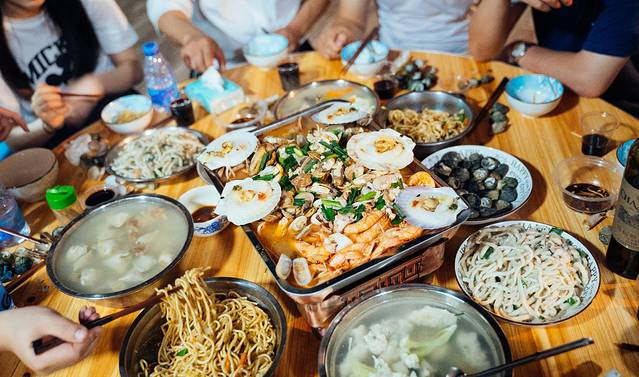 这些海鲜全部是村里的渔民今天刚捕捞的,味道非常新鲜,加一个加热炉,越吃味越香