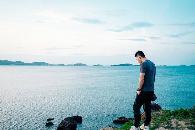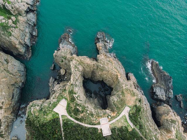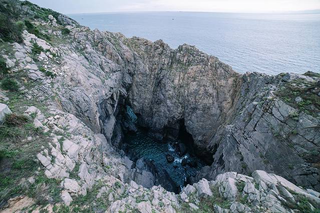 此次行程第一个目的地也是我最喜欢的地方。门票15块,一小段平路,一小段石台阶,走上去不会太费时费力。蓝色的天,蓝色的海,配上嶙峋的礁石,整个景色大气又有层次。站在高处往远看,海面视野辽阔,吹着海风神清气爽。俯瞰仙人井里海水激起白色浪花灌进来,很有气势。从观景台下来再往下走,就是比较好出片的地方,这个景很有东南亚悬崖海边的感觉,分分钟拍出大片,一定要多拍拍。