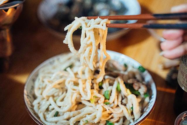平潭特色鱼面,以黄鱼或马鲛鱼为主料。将鱼肉捣成稀糊状,加少量食盐与调味品,粘上适量研末薯粉,碾成薄皮,切为细丝煮熟,捞起冷却。烹调时,配肉丁、虾仁、葱段、胡椒粉等佐料,入高汤煮滚即成,色、香、味俱佳,嫩中带脆,味荤且清。炒烹皆宜。