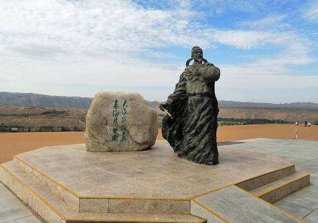 沙山之上设立了一处王维观景台,一座塑像定格了这位被后人盛情挽留的过客。翘首挥笔、捋须沉思、豪气冲天,观景台前扶老携幼的游客聚集在王维塑像下留影、远眺、吟读诗句,我也趁兴带娃又打卡一处古诗景地。