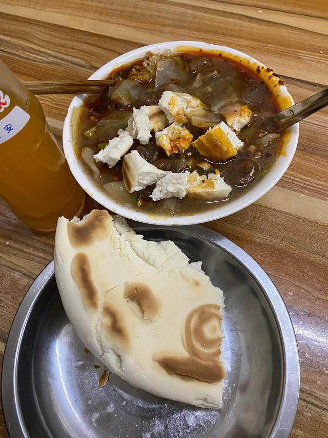客人很多,找位置还是有点难度的,还好有一桌游客刚离开……低头一看,除了汤,其它都剩下了;我们果断选择俩人吃一份,然后开始模仿本地人——掰馍