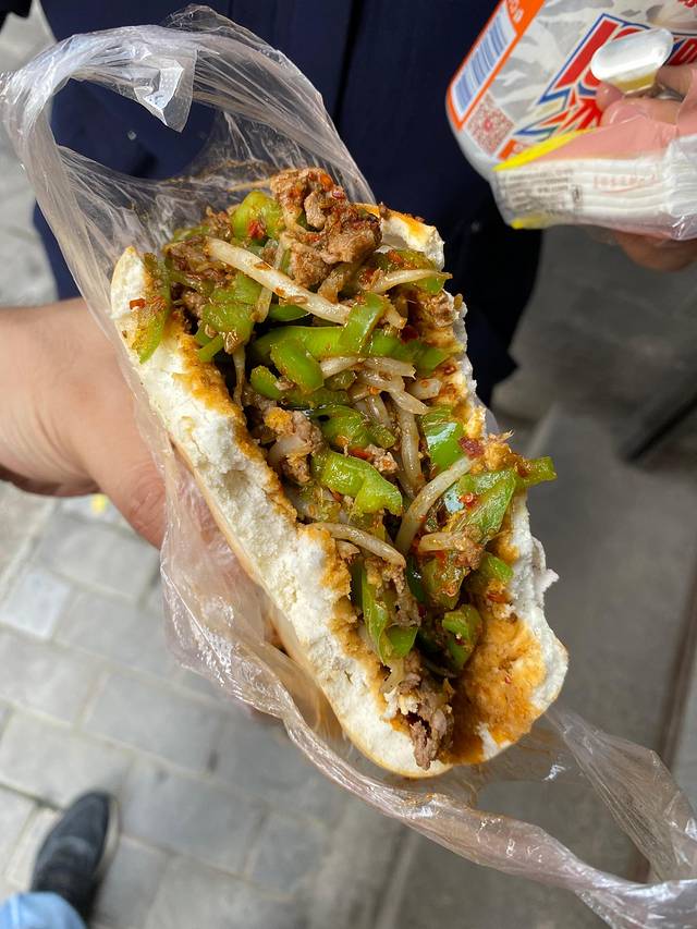 最终我们的第一顿选择了一家不记得名字的小店,点了一个15元的羊肉夹馍···(心想:15一个有点贵哦,不过考虑是在景区里,也能接受,于是,于是,我看见店家把一铁锅炒好的菜,倒进了一个有半个脸大的馍里……瞬间觉得15块钱也太便宜了)于是乎,一个馍喂饱了俩人,也奠定了我们在西安只配吃一人份儿的基础……