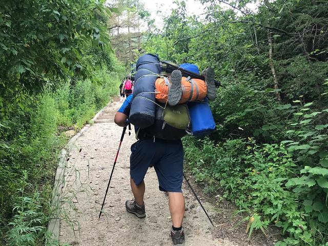 山脚下农家院补给,打包好所有的装备,露营装备,晚餐,水,登山杖,冲锋衣,灶头气罐,开始了本地重装扎营之旅,先是一段一公里左右的水泥登山路,到达骡马道分叉口,已经感觉老胳膊老腿,有些酸了,等后队到达简单说明后便兵分两路,体力不佳的可以走缓坡上去,体力ok的便走另一侧陡坡树林上去