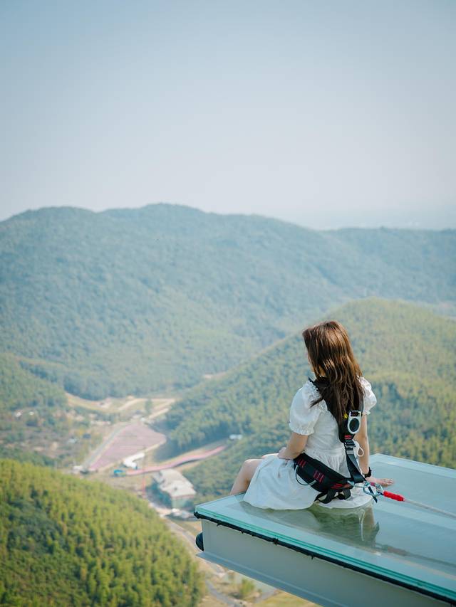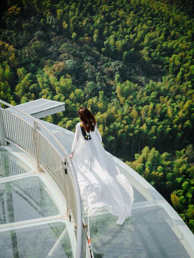 大概是恐高患者最怕的一项运动了,天际探险塔顶部四周的玻璃桥,外圈周长约100米。(半径15m),虽然有足够的安全保障措施,但是因为是走在玻璃之上,脚下是万丈深渊,最外测还没有护栏,踏步于此更像是在云端漫步,脚下是百米高空,眼前是缥缈山间的秀美景色,树海山峰,蓝天白云也都一览无余,与山水对坐,独享清欢。