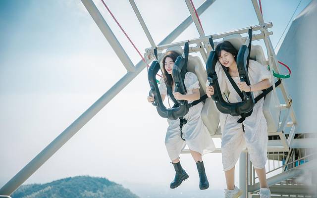 两个小姐妹一个紧闭双眼,一个开心大笑,等待秋千飞出的那一刻,飞射出去的时候一定记得按下相机,记录下勇敢的这一刻哦!