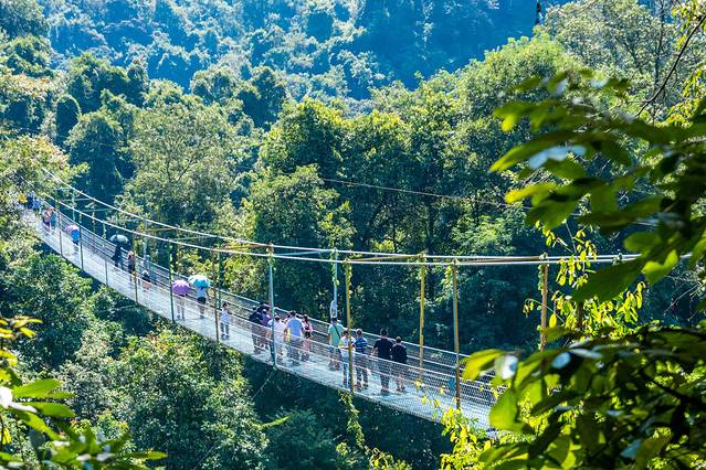 路途的终点就是广西第一条悬索玻璃桥,也是全国唯一的“会跳舞的玻璃桥”——双龙沟玻璃桥,也叫表白桥。人在桥上行走,桥身可以左右晃,宛如跳“空中芭蕾舞”,桥上有穿着苗族服饰的人们,可以与她们合影留念。