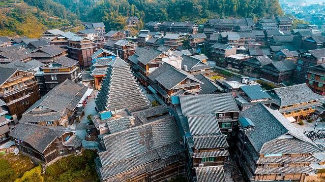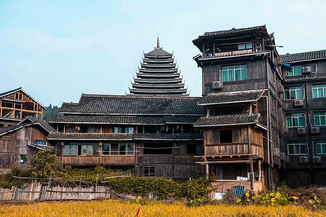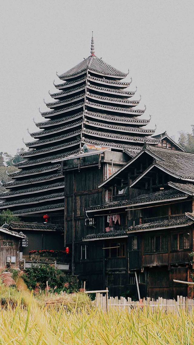 在众多座鼓楼中最令人震撼的两座分别是岩寨新鼓楼和平寨新鼓楼。岩寨新鼓楼建成于2005年,四根主柱和十二根附柱支撑起这座鼓楼,楼高将近三十米。站在远处看,十五层的飞檐呈递减趋势向上,但每一层的檐角却又如出一辙,极其精致,就好像一座上小下大的巨塔,稳稳地落在这一方土地之上,守护着寨子里的侗族人家。