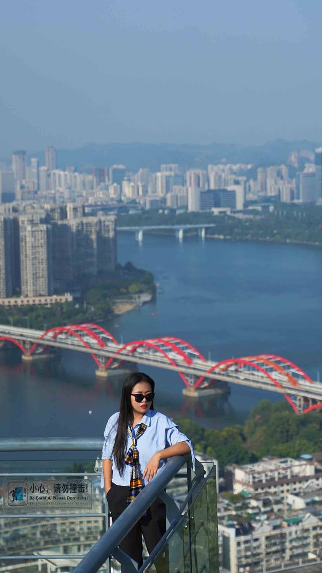 攀登至山顶时,视野慢慢地开阔起来。到达玻璃观景平台后,呈现在眼前的便是一幅极为辽阔的画面。高远的天空下,穿插交错的道路将城市分割成不同的区域。城市中,一栋栋摩天大楼整齐的排列着。古色古香的古式建筑点缀在高楼大厦中,为城市增添了几分古典的韵味。柳江穿城而过,宛若一条绸带。流淌的江水在阳光的照射下泛着微波,几座大桥横亘在柳江水上。汽车穿梭在柳江大桥上,从江的一侧抵达江的另一侧。