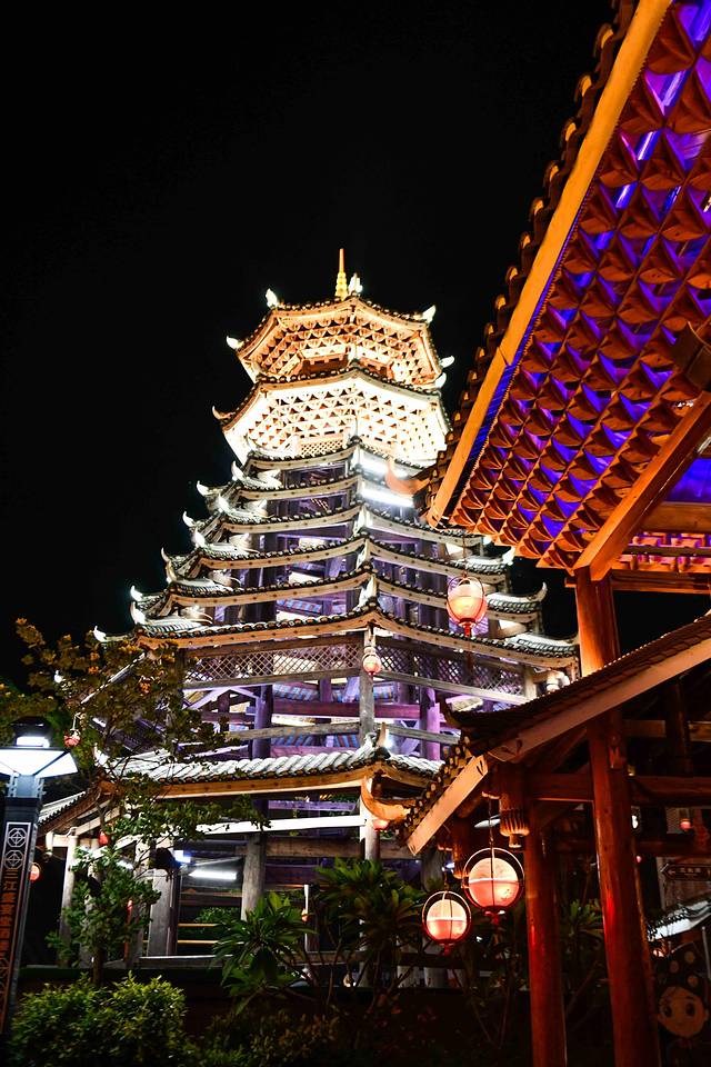 梦呜苗寨的建筑风格最大程度地还原了山区的苗寨。木质的吊脚楼,清澈的河水缓缓流过,平日里的苗寨就是如此的宁静,夜晚的苗寨像是夜空中的星,在黑暗中发出一束束光,洒在河里,树叶上,游客的眼中。