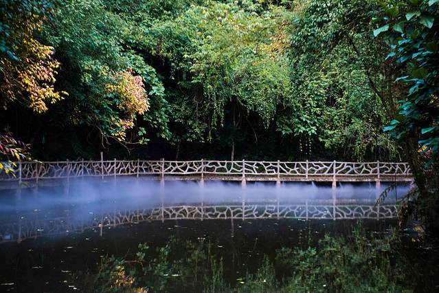 景区内树木丛生,犹如天然屏障,郁郁葱葱的古树倒映在水中,河流也变得绿油油,古声古色的船只悠悠驶过,留下一阵涟漪,顺着木质的栈道沿岸而走,赏一眼此景又向山上走去,嗅着林间的清新空气,身体虽有些疲惫,但内心充盈又轻松。