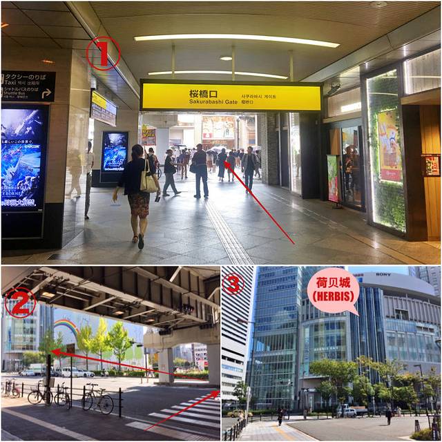 ① 从中央南口出来后过横道(目前正在维修中)。②然后往右手边直走,③然后再过2个横道就能看到荷贝城了!