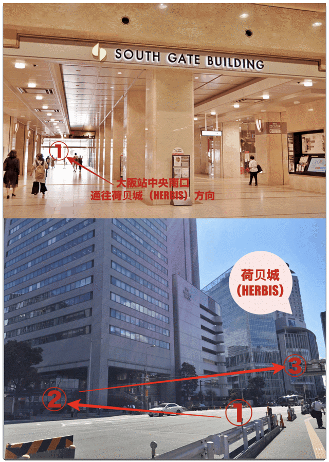 ① 从大阪站的樱桥口检票口出来后请向右走到人行道前面。②穿越人行道后立刻左拐。③走到底后就是荷贝城了!