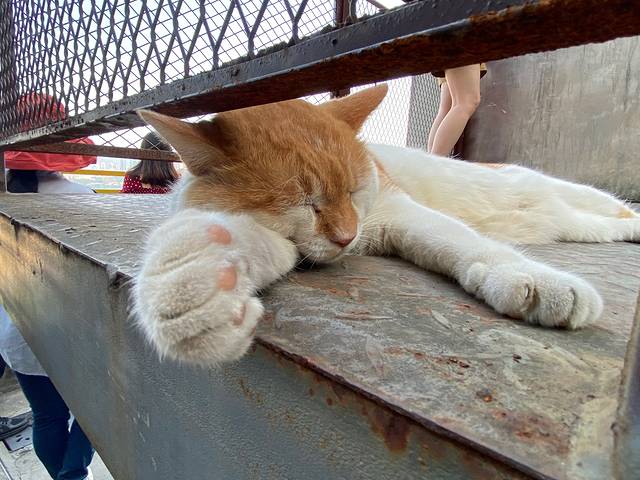在熙熙攘攘的游客中间熟睡的橘猫……