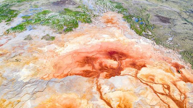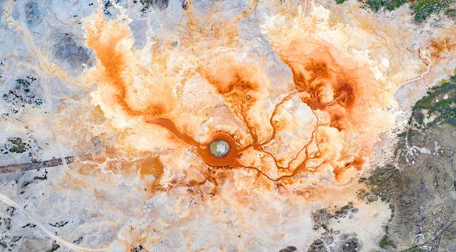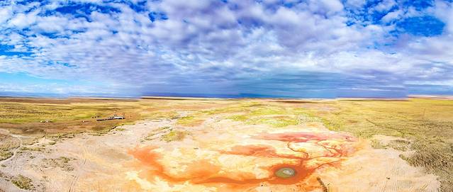 艾肯泉的泉眼如同沸腾的开水,不断翻滚上涌,从空中俯瞰,泉眼与喷涌出的泉水以及周围土地上深红色环带状的沉淀物,形成了这样奇特的景观,“恶魔之眼”。