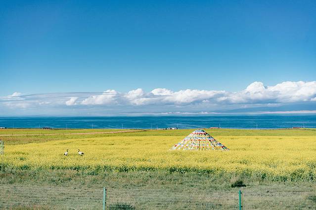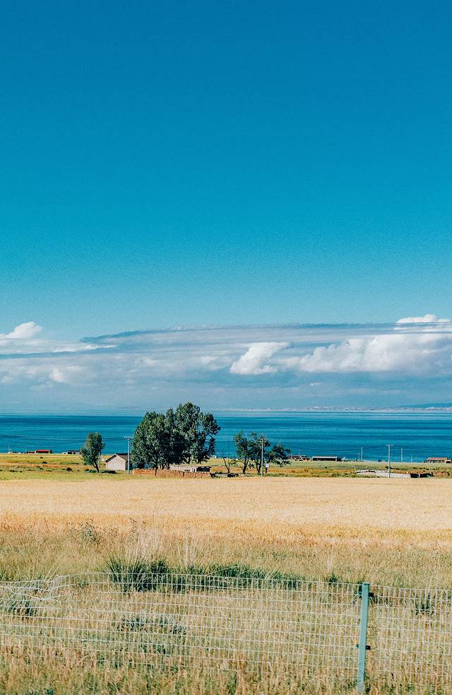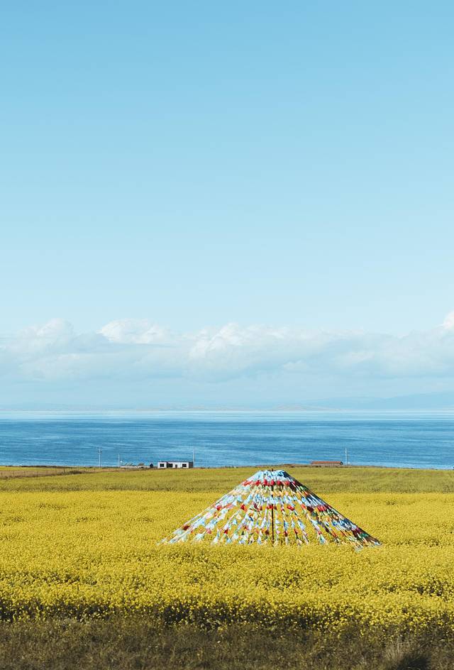有很长一段路是这样,车子沿着青海湖驰骋,向右看,湖面广阔似海,还有大片大片的油菜花田,这应该是全中国最晚可见的油菜花了吧。