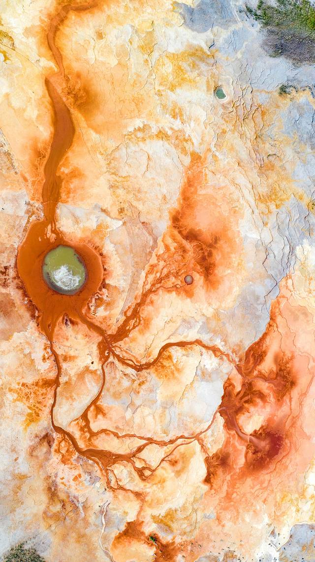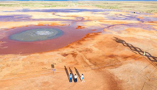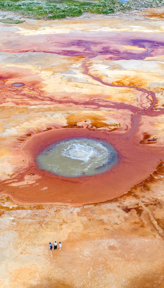 航拍可以看到,艾肯泉周围,红色渐渐向有植被的绿色过渡,也非常好看▼