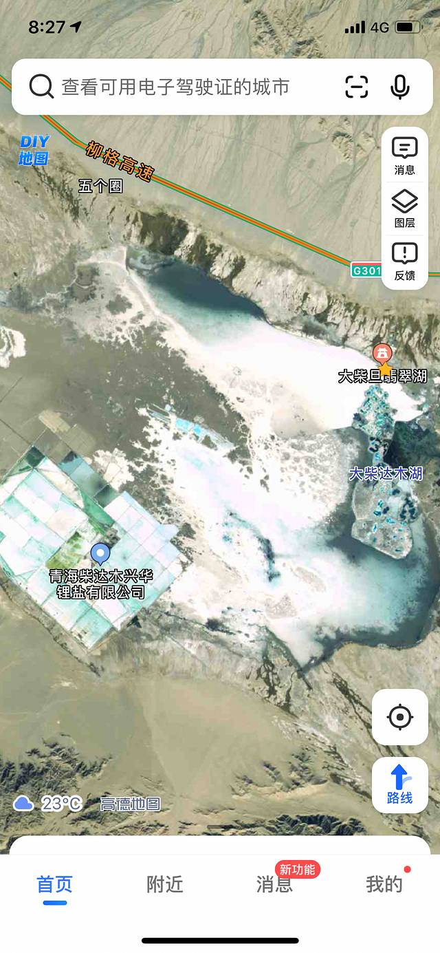 从导航截图上,可以看到旁边的锂盐公司,海西的盐湖旁基本都会有这样的大型化工企业。盐湖的形成也是因为这一片曾是原大柴旦化工厂盐湖采矿队的采矿区,经多年开采形成大大小小的采坑,才变成了如今美丽的翡翠湖。