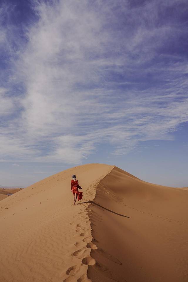 沙漠上的驼队渐行渐远,我换上了一套他为我准备的衣服出去拍照。