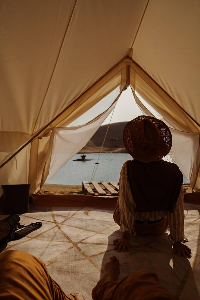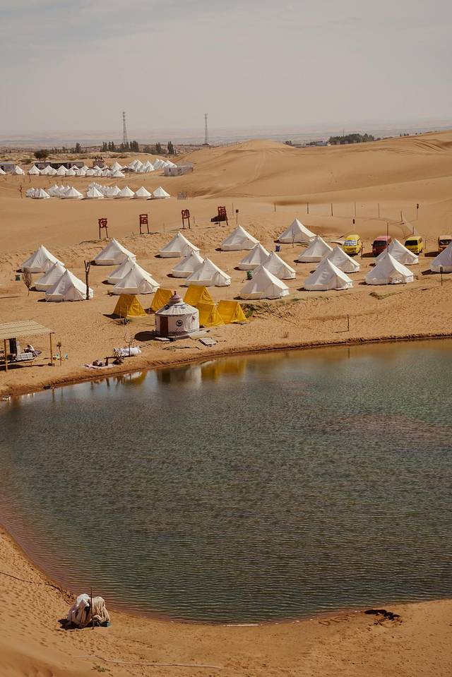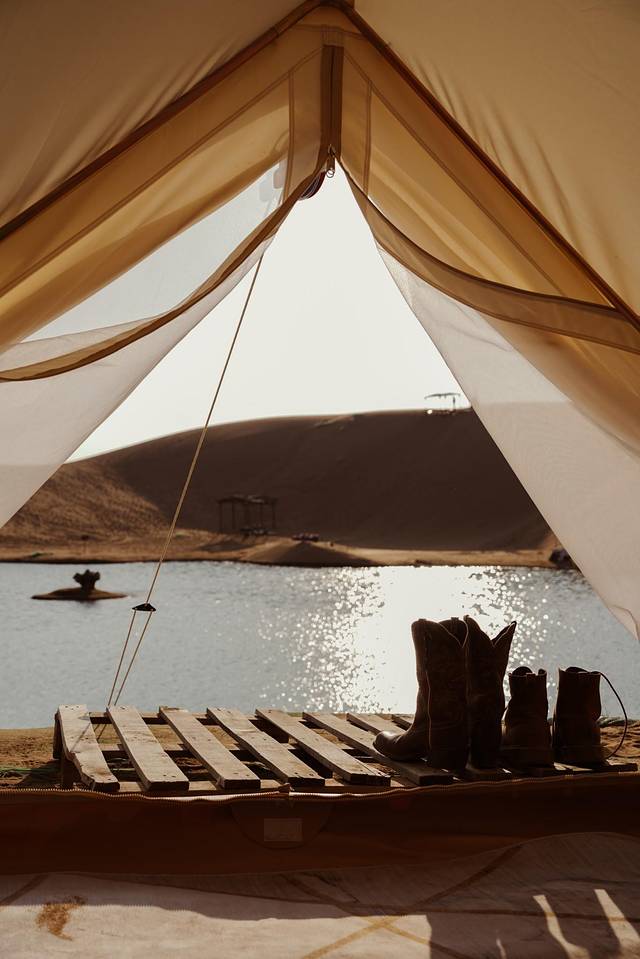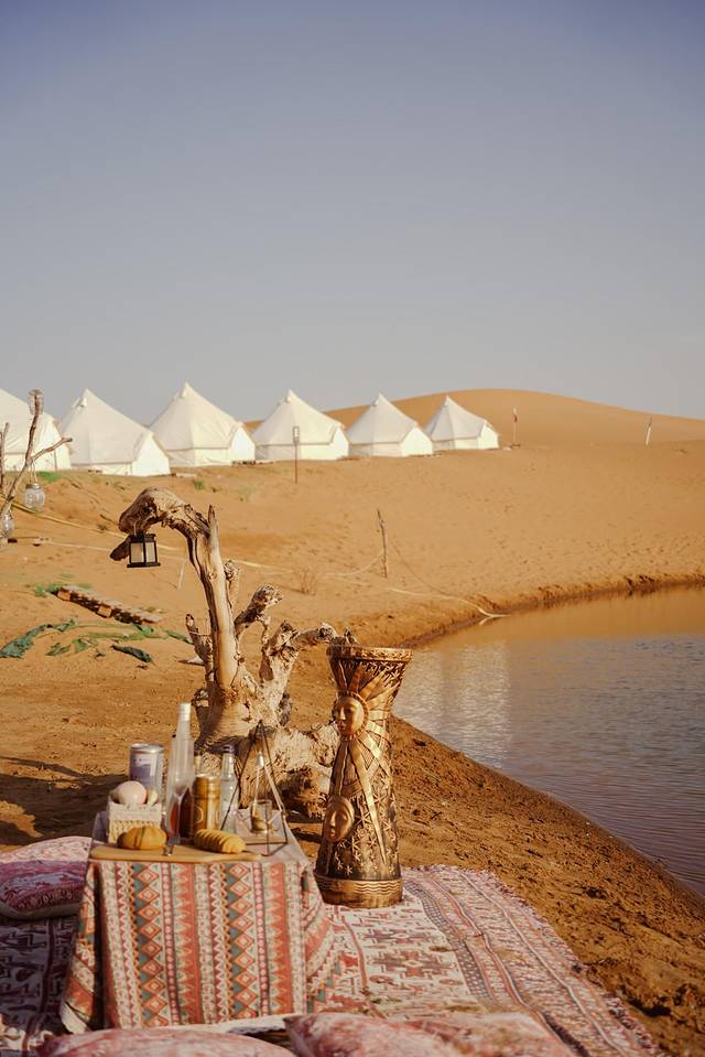 进入沙漠时是黄昏时分,帐篷正对的小湖泛着闪闪的波光,时光仿佛静止了一般,让我一下子回到了那个与你初见的午后。