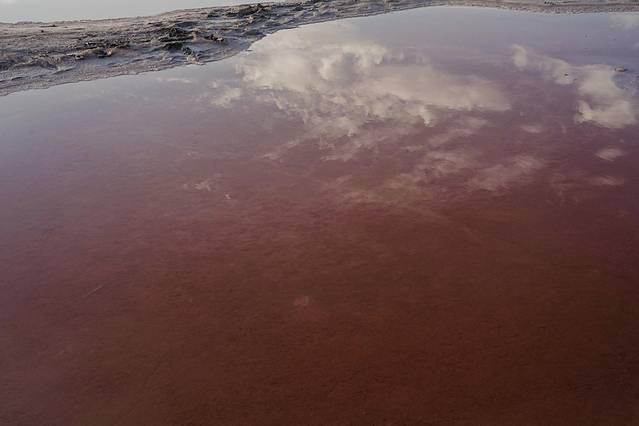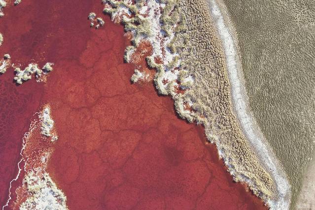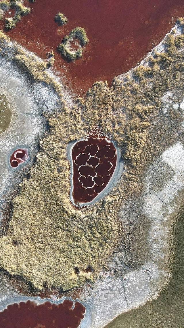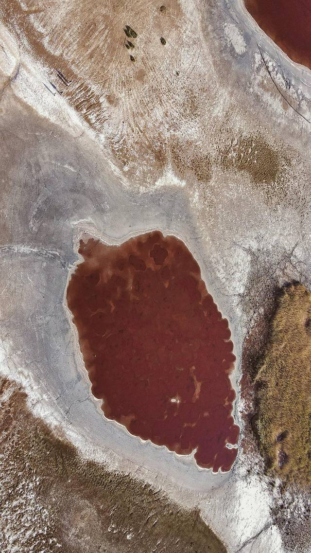 湖水是像血液一般的深红色,白色的盐碱地如脉络一般分布,在阳光的照耀下,闪烁着鲜活的光芒。